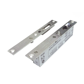 The FSH HL1260 is a high torque motor driven hook lock for a sliding door. It can be installed vertically in the door frame (lock style) with the strike plate mounted on the edge of the door.