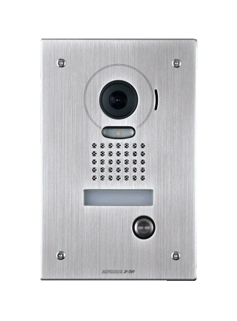 Video Door Station - The JP-DVF is a vandal resistant, surface mount door station used with the JP hands-free, colour video entry series. The unit mounts directly to wall surface or to a 1-gang box with MKW-P plate. The JP-DV faceplate is cast zinc, the call button is metal and the camera is protected with a clear polycarbonate lens cover. The JP-DV features a colour CMOS camera, speaker and mic for communication, illuminated call directory and white illumination LED for low light conditions.